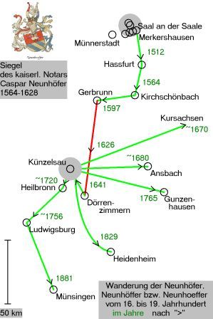 Etwa zur selben Zeit wie Katharina in Wülfershausen oder Saal hat Petter Newnhoffer [NE1] gelebt. Er wurde im Jahre 1512 in Hassfurt eingebürgert und war von Beruf Gerber. In den katholischen Matrikeln von Hassfurt, die später 1580 (~), 1581 (oo) bzw. 1603 (+) beginnen, ist unser Name nicht genannt. Man beachte jedoch, dass die Neunhöfer, die etwa 100 Jahre später in Saal gelebt haben, den Beruf des Weißgerbers ausübten. Petter ist vermutlich das älteste Glied im Stammbaum, der von Michael Neunhöffer zusammengestellt wurde, also auch der sich daraus verzweigenden Linien . Über das Leben von Petters Sohn Caspar Neunhöfer (1534-1607) [NE11] wissen wir heute vor allem aus seinem Epitaph, der von Groß (1727) überliefert wurde, sehr gut Bescheid. Nach einer schweren Kindheit in Hassfurt trat er mit 15 Jahren in das Kloster Theres ein und wurde dort am 15. Mai 1554 zum Priester geweiht. Im Jahre 1564 konvertierte er zum evangelischen Glauben, gründete eine Familie und wurde Pfarrer in Kirchschönbach bei Prichsenstadt. Der Lebenslauf seines Sohnes, Johann Neunhöffer sen. (1567-1654) [NE112], war außerordentlich bewegt: Zunächst besuchte er die Schule in Schweinfurt, 1583 bis 1587 das Gymnasium in Hof, 1587 schrieb er sich in die Matrikel der Universität Jena (Neunhöffer, Joh. Pripolitan. Franc. 80 1587a) und 1593 in Tübingen ein, um dann als Präzeptor und Magister beim Grafen Gottfried von Castell tätig zu sein. 1597 bis 1611 war er evangelischer Pfarrer in Gerbrunn, das heute ein Vorort von Würzburg ist und wortwörtlich in Sichtweite des katholischen Würzburger Fürstbischofs liegt. Im Zuge der Gegenreformation wurde er vom Domkapitel zu Würzburg angefochten, von seiner Pfarrei vertrieben, lebte als Exulant beim Grafen von Castell in Rüdenhausen. Er übte schließlich 1626 bis 1650 das Amt des Pfarrers in Dörrenzimmern aus. Über Johann sen. und seinen Vater Caspar berichtet M.J.M. Groß (1727) in seinem Lexikon evangelischer Jubelpriester: